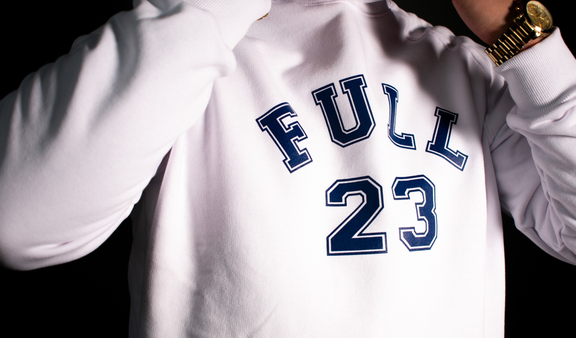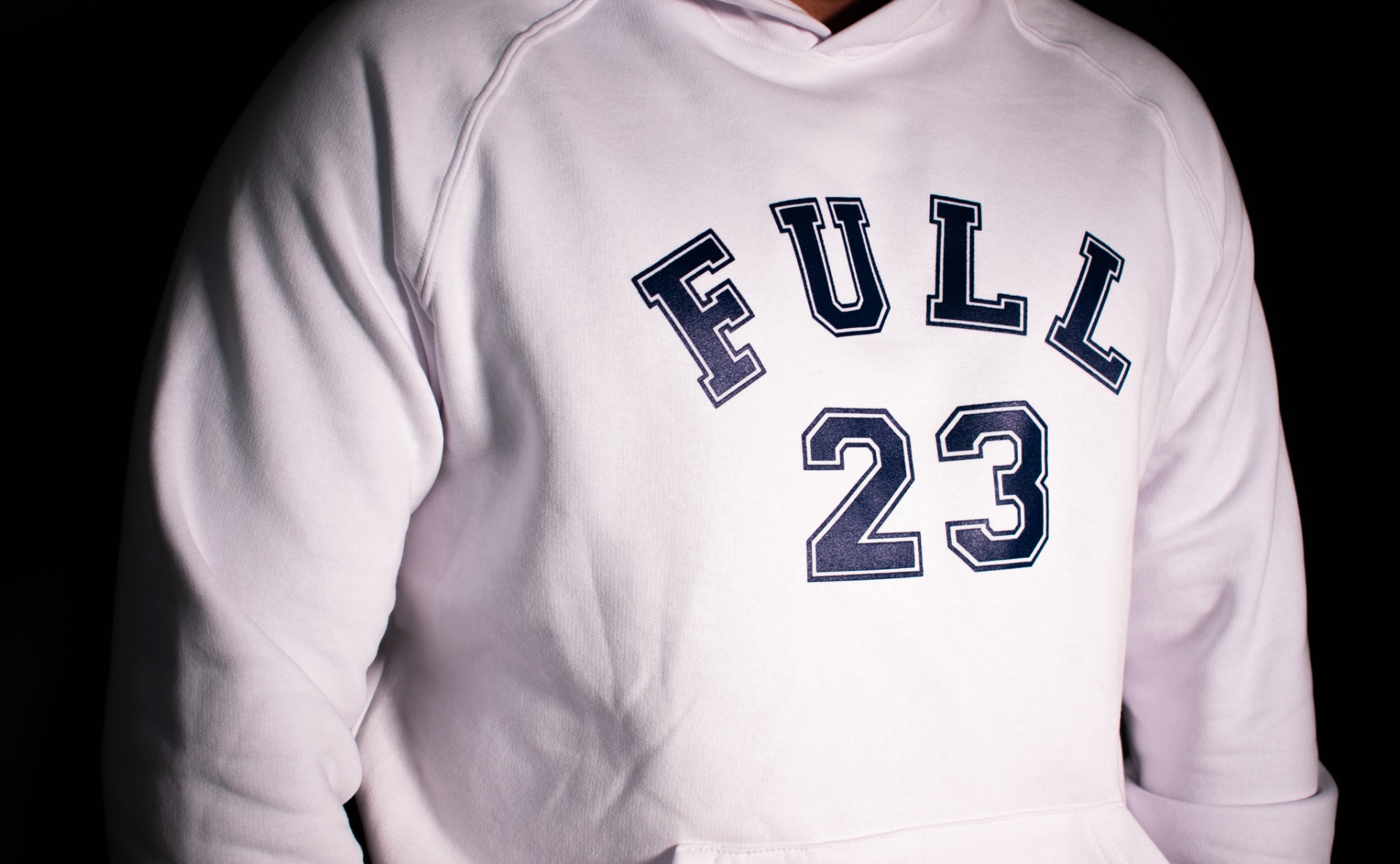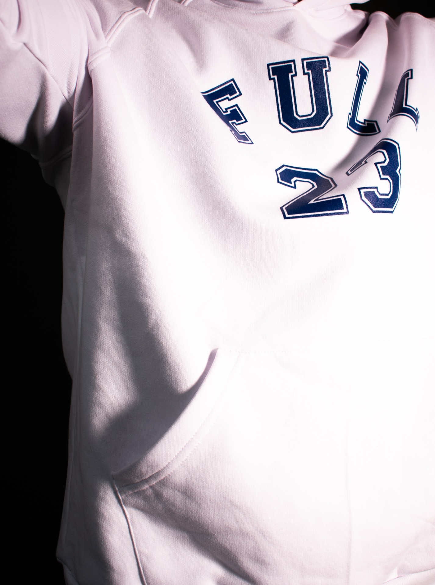 Buzo canguro blanco 100% algodón con friza invisible, estampado logo "Full 23"